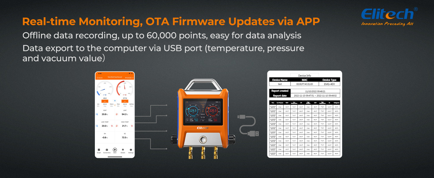 Elitech EMG-20V Intelligent HVAC Digital Manifold 2 Valves with 5” Smart Touch Screen
