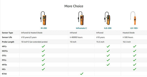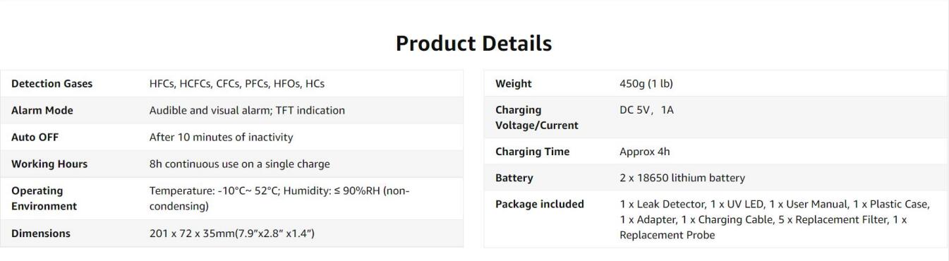 • Detecting All Halogenated Gases: It can detect all kinds of halogen refrigerants including CFCs, HFCs, HCFCs, HCs, HFOs and mixed refrigerants such as R11/R22/R404a/R410a/R600a/R1234yf/R-454B/R-32 and Blends such as AZ-50, HP62, MP39 etc.