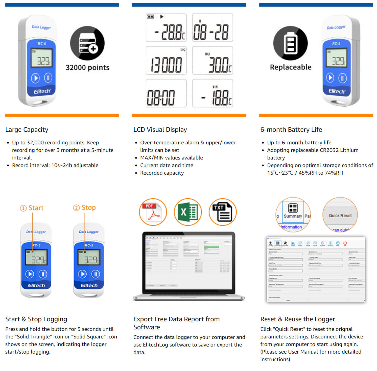 Enregistreur de données de température USB Elitech RC-5 avec 32 000 points d'enregistrement